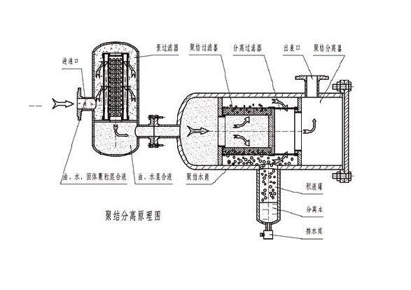 聚結(jié)系統(tǒng)由一組聚結(jié)濾芯組成,聚結(jié)濾芯采用了獨(dú)特的極性分子結(jié)構(gòu),油液中的游離水及乳化水在通過(guò)濾芯后,被聚結(jié)成較大的水滴,再依靠重力的作用下沉降至儲(chǔ)水罐內(nèi)。